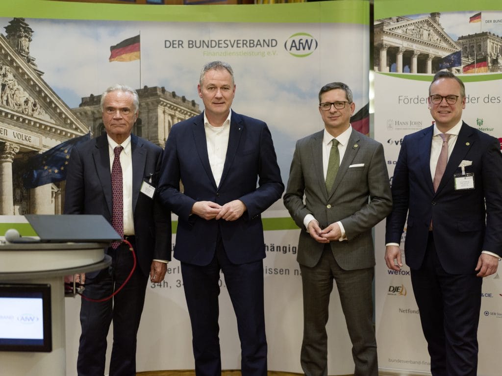 „Nach dem Provisionsrichtwert ist vor einem möglichen Provisionsverbot“, warnt AfW-Vorstand Frank Rottenbacher. Damit war eines der wichtigen Themen für die rund 60 Teilnehmerinnen und Teilnehmer des 19. AfW-Hauptstadtgipfels in Berlin gesetzt. Grund: ein Provisionsverbot für die Anlageberatung im Rahmen von Mifid II – also damit indirekt auch für 34f-Vermittlerinnen und -vermittler – ist ernsthaft wieder im Gespräch. Das Thema galt auf nationaler Ebene als erledigt, doch nun gibt es neue Bestrebungen in Brüssel, EU-weit ein Verbot der Provisionsberatung einzuführen. Schon im Januar könnte im worst case ein Verordnungsentwurf der EU-Kommission auf dem Tisch liegen. „Die deutsche Haltung zu dem Thema muss klar und eindeutig sein und auch in Brüssel kommuniziert werden“, so Rottenbacher. Die Vertreterinnen und Vertreter der Fördermitgliedsunternehmen des Verbandes nutzten daher die traditionsreiche Veranstaltung, um die eingeladenen Finanzexperten von FDP, SPD und CDU mit konstruktiven Nachfragen für ihre Belange zu sensibilisieren.