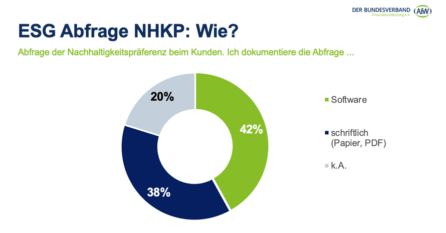 Wie gehen Vermittlerinnen und Vermittler in der Praxis mit der verpflichtenden Abfrage der Nachhaltigkeitspräferenzen ihrer Kunden um? Die großen Unterschiede in der Branche und welche Tools zum Einsatz kommen, hat der AfW im Rahmen eines umfassenden Stimmungsbildes der Branche erhoben.