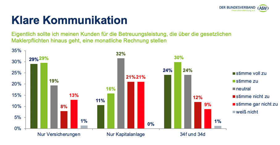 Betrachtet man auch hier die diesbezügliche Transparenz von Finanzanlage- oder Versicherungsvermittlern, fällt erneut der deutliche Vorsprung der 34f-Vermittler auf. Drei Viertel (74 Prozent) von ihnen machen ihre Vergütung mehr oder weniger transparent, während dieser Wert bei den Versicherungskollegen lediglich bei 37 Prozent liegt. Entsprechend lehnen fast dreimal so viele 34d- als 34f-Vermittler die Transparenz bezüglich ihrer Vergütung ab (37 zu 13 Prozent). „Dieses Ergebnis verwundert natürlich wenig. Im Investmentbereich besteht schon seit mehr als 10 Jahren die Pflicht, die vereinnahmte Provision dem Kunden gegenüber offenlegen – entsprechend den Wohlverhaltensregeln des WpHG.“, so Wirth.