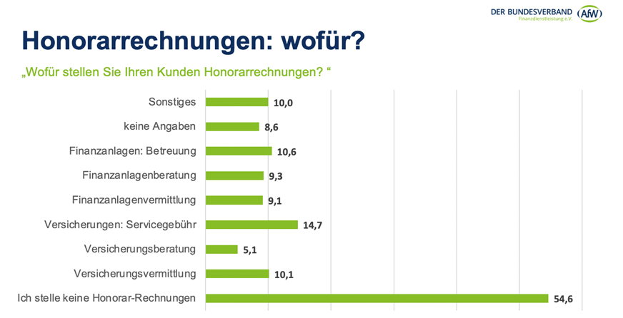 Auch hier geht die Schere je nach Vertriebsschwerpunkt deutlich auseinander, diesmal mit umgekehrten Vorzeichen. Während nur rund jeder vierte 34f-Vermittler (27 Prozent) an eine Rechnung denkt, tut dies ein mehr doppelt so großer Prozentsatz der 34d-Kollegen (58 Prozent). Folgerichtig hat die Mehrheit noch keine Servicevereinbarung mit den Kunden abgeschlossen. Wenn Vermittler aber Honorare erheben, nennen sie Servicegebühren im Bereich Versicherungen (14,7 Prozent), für die Betreuung im Bereich Finanzanlagen (10,6 Prozent) sowie für die Versicherungsvermittlung (10,1 Prozent) am häufigsten (siehe Grafik).